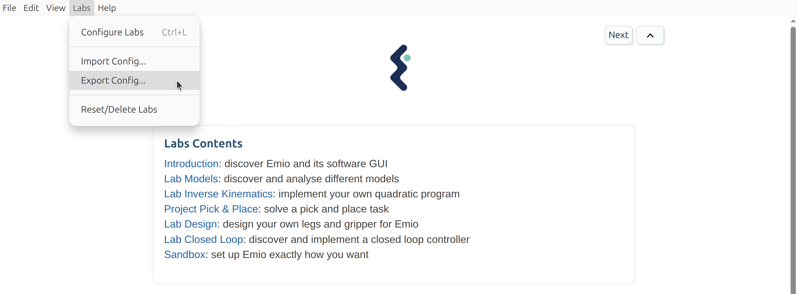 You can also export and import your labs configuration as a JSON file. This is useful for sharing your setup with colleagues or to quickly set up multiple installations of Emio Labs with the same configuration.