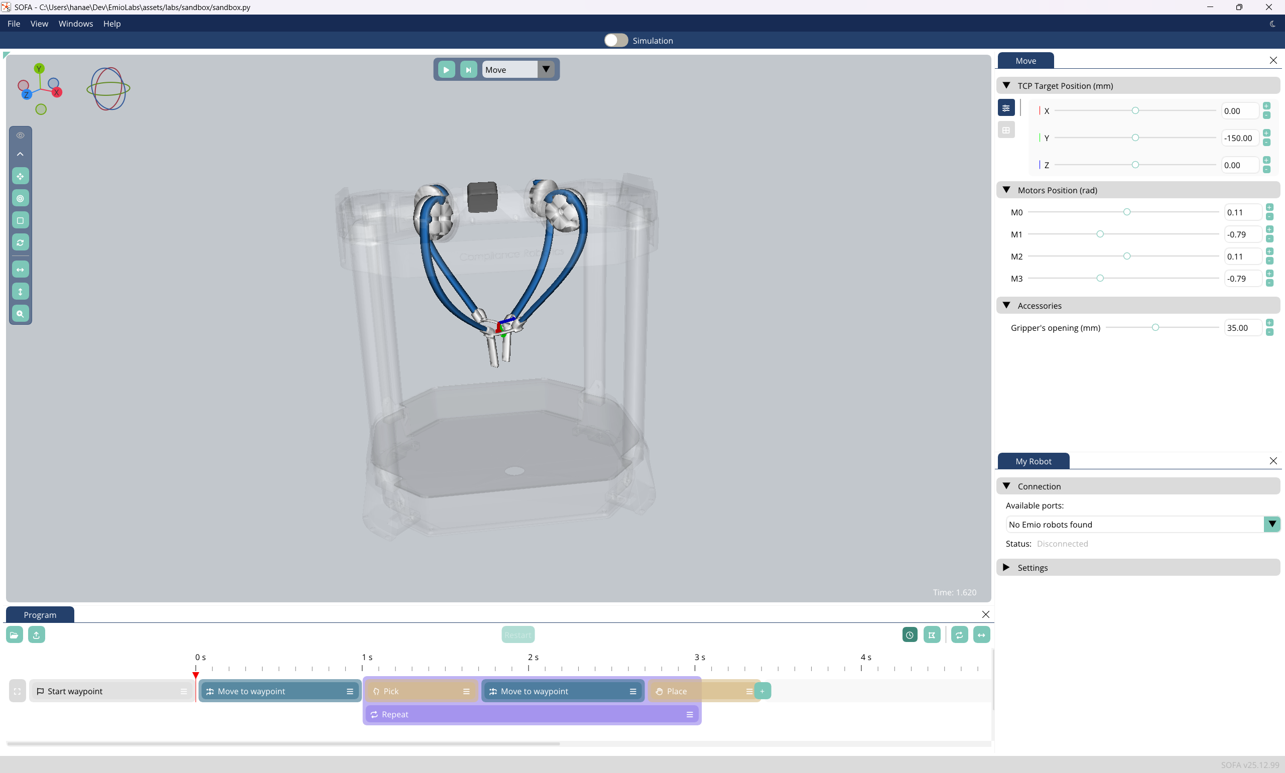 SOFA is an open-source framework designed for interactive mechanical simulations, with a strong focus on bio-mechanics and robotics. At Compliance Robotics, we have developed a dedicated graphical user interface (GUI) for SOFA, designed specifically for robotics applications allowing to control and program robots with ease.
